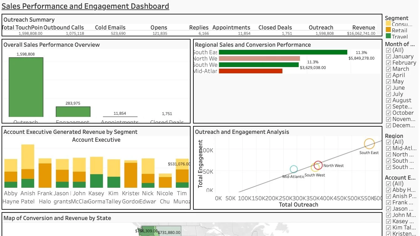 This Tableau dashboard delivers actionable insights by analyzing sales trends, team performance, and customer engagement. It highlights opportunities for growth, identifies patterns in customer behavior, and enables strategic decision-making through data-driven visuals.